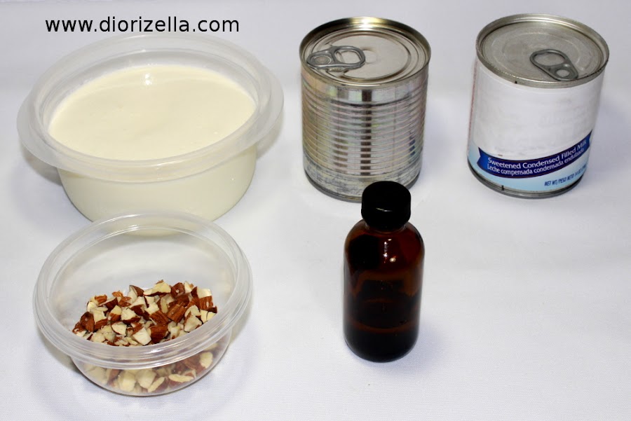 Los ingredientes que vas a necesitar son: "heavy cream" o crema par batir, leche condensada, almendras picadas y extracto de almendras.