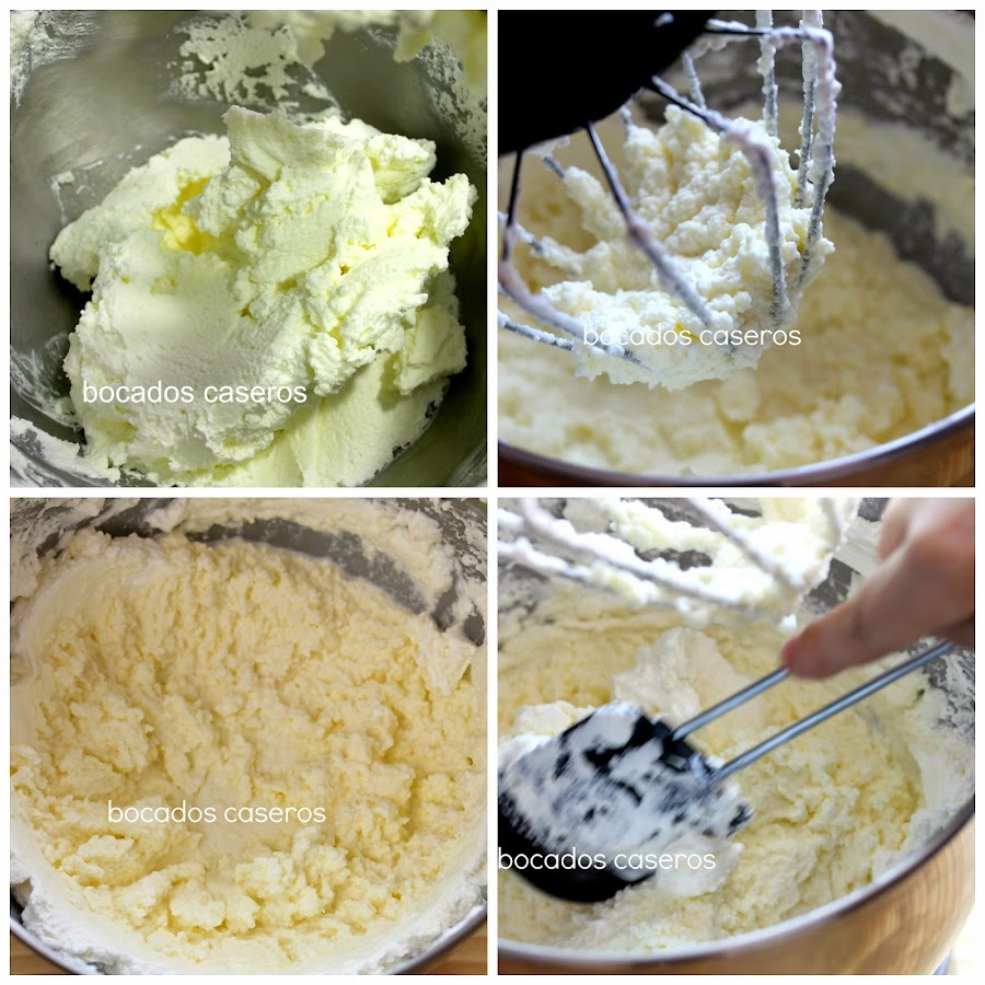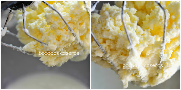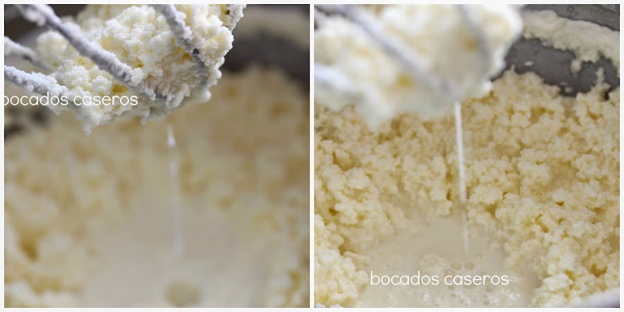 Parece que se corte la nata (crema de leche) y vemos que se van uniendo en gránulos gruesos mientras el líquido se va quedando en el fondo del recipiente y al mismo tiempo, cambia de color de blanco a amarillo. Seguimos batiendo...
