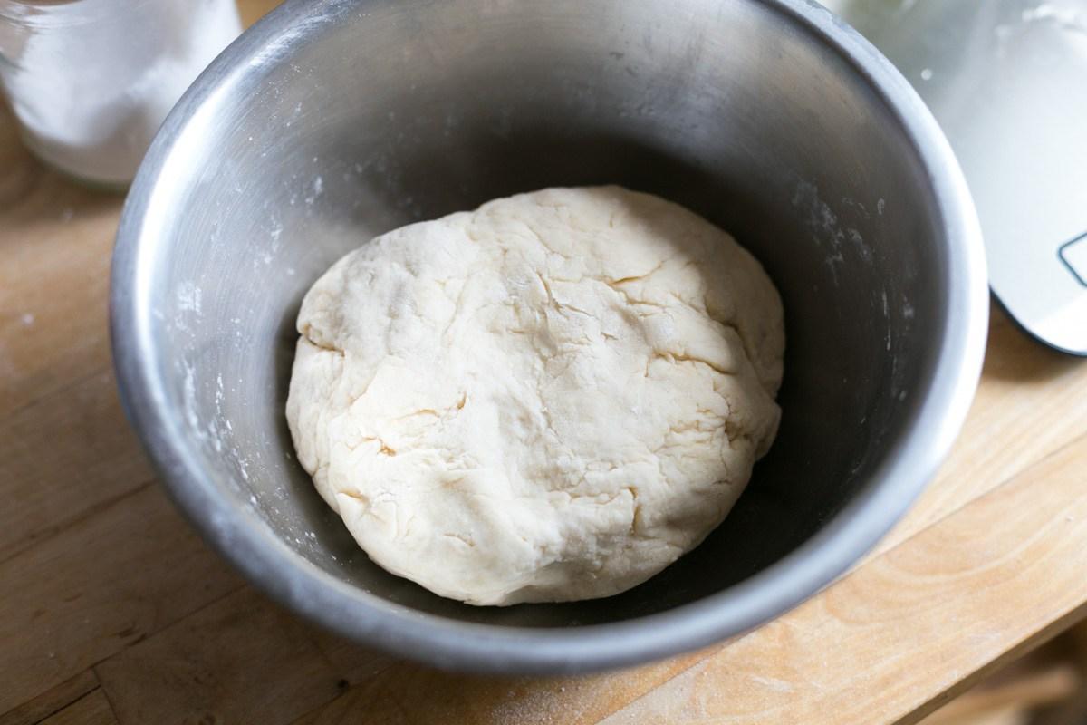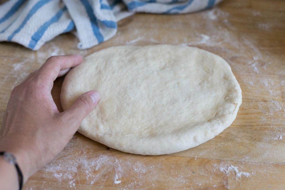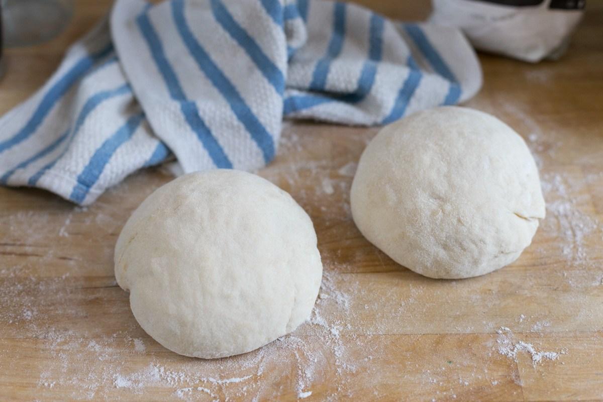 Enharinar la superficie de una mesa, colocar la masa sobre ésta y dividirla en 2, 3 o 4 porciones (dependiendo del tamaño deseado), amasar durante unos segundos y darle forma de bola. Si no vas a preparar todas las pizzas inmediatamente envolver las bolas de masa en una bolsa para congelar o film plástico para utilizar otro día (más abajo te cuento sobre la pizza con reposo de 2 a 3 días en el refrigerador).