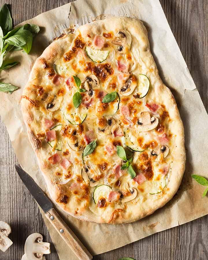 Con esta Pizza sin amasado del maestro de las masas Ibán Yarza no echaréis de menos salir a comer vuestra pizza favorita, ¡os lo prometo! La masa queda espectacular tanto de textura como de sabor. A mí personalmente me gusta dejarla reposar al menos 48 horas porque creo que la masa gana sabor, pero también hay días que me puede el ansia y saco la masa de la nevera pasadas 20 horas y también queda una buena pizza. Los toppings, los que tú quieras, yo os invito a probar esta pizza carbonara que es súper sencilla y queda muy rica.