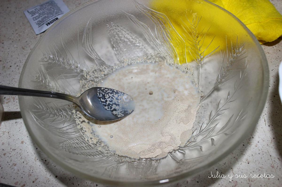 En un bol ponemos el agua templada y desmenuzamos la levadura hasta que esté totalmente diluida. Añadimos el azúcar.