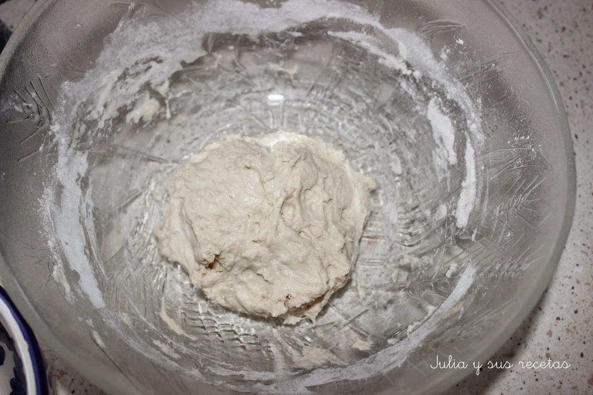 Añadimos la harina poco a poco mientras mezclamos con una cuchara o espátula. Quedará una masa pegajosa.