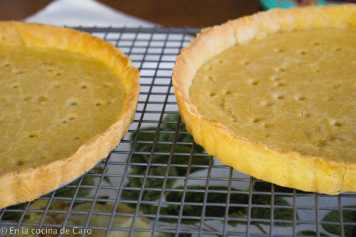 Retiramos nuestra masa de la nevera, cubrimos con papel de horno, le colocamos pesos, ( esas bolas de cerámicas, legumbres secas, arroz). Horneamos por 10-12 minutos, retiramos el peso y horneamos otros 10 minutos para que tome color.