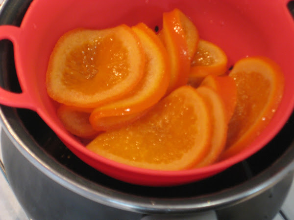 3. Una vez que el que azúcar esté disuelto y el agua hierva, poner las rodajas de naranja de una en una.