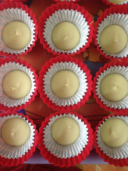 Ahora derretimos nuestro chocolate blanco en este caso, en el microondas a intervalos de 30 segundos y removiéndolo para que no se nos queme y con la ayuda de una cucharita cubrimos bien con él cada imagen, he usado tres tabletas de chocolate blanco del merdacona para las 24 imágenes.