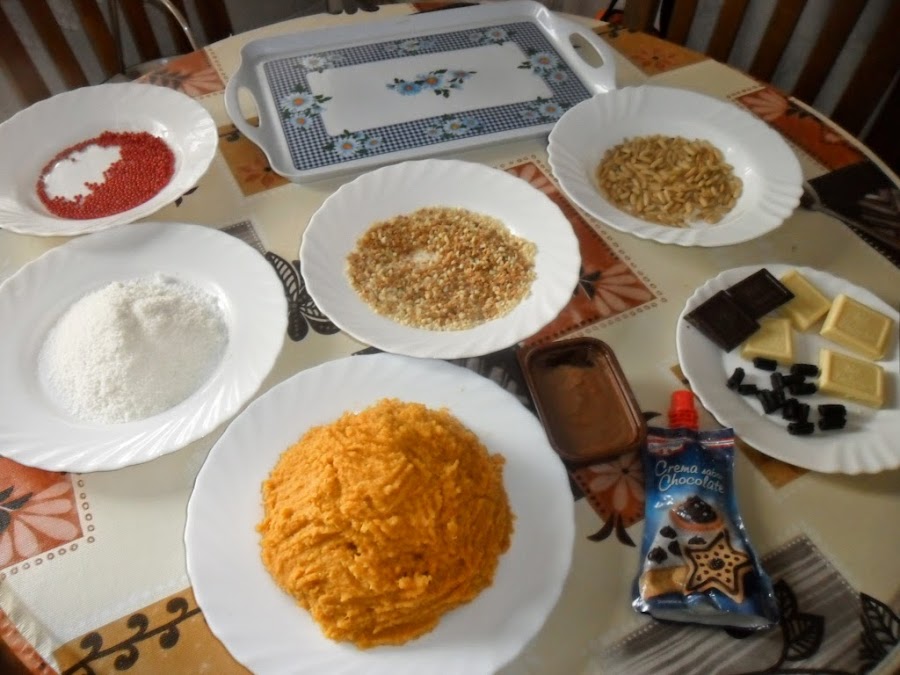 Ponemos en cada platito los ingredientes de rebozar y relleno: coco rallado, topins de color rojo, piñones, sésamo caramelizado, almendra gravilla caramelizada o cruda, chocolate en tableta negro y blanco, regalíz negro, crema de chocolate con avellanas y chocolate en crema o lo que mas nos guste.
