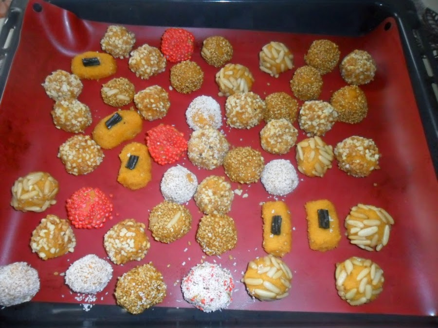 Batir con un tenedor la yema de huevo y pincelamos los panellest de piñones, sésamo y almendras, llevar al horno con cuidado que no se quemen los piñones porque amargan.