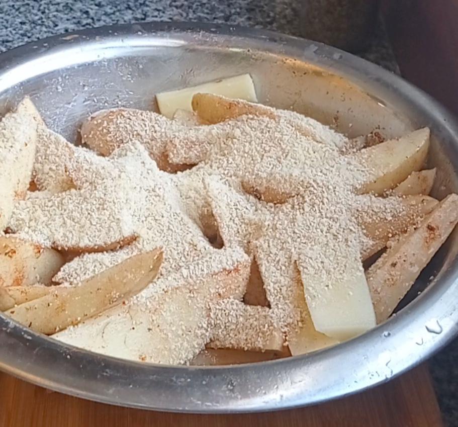 Mientras, poner las papas en un bol y mezclar con aceite y los condimentos, yo lo hago con las manos para que se impregne bien todo, agregar la polenta o pan rallado y el queso rallado, fijate que quede todo bien incorporado, si hace falta un poco mas de polenta o pan rallado agrégalo ahora.