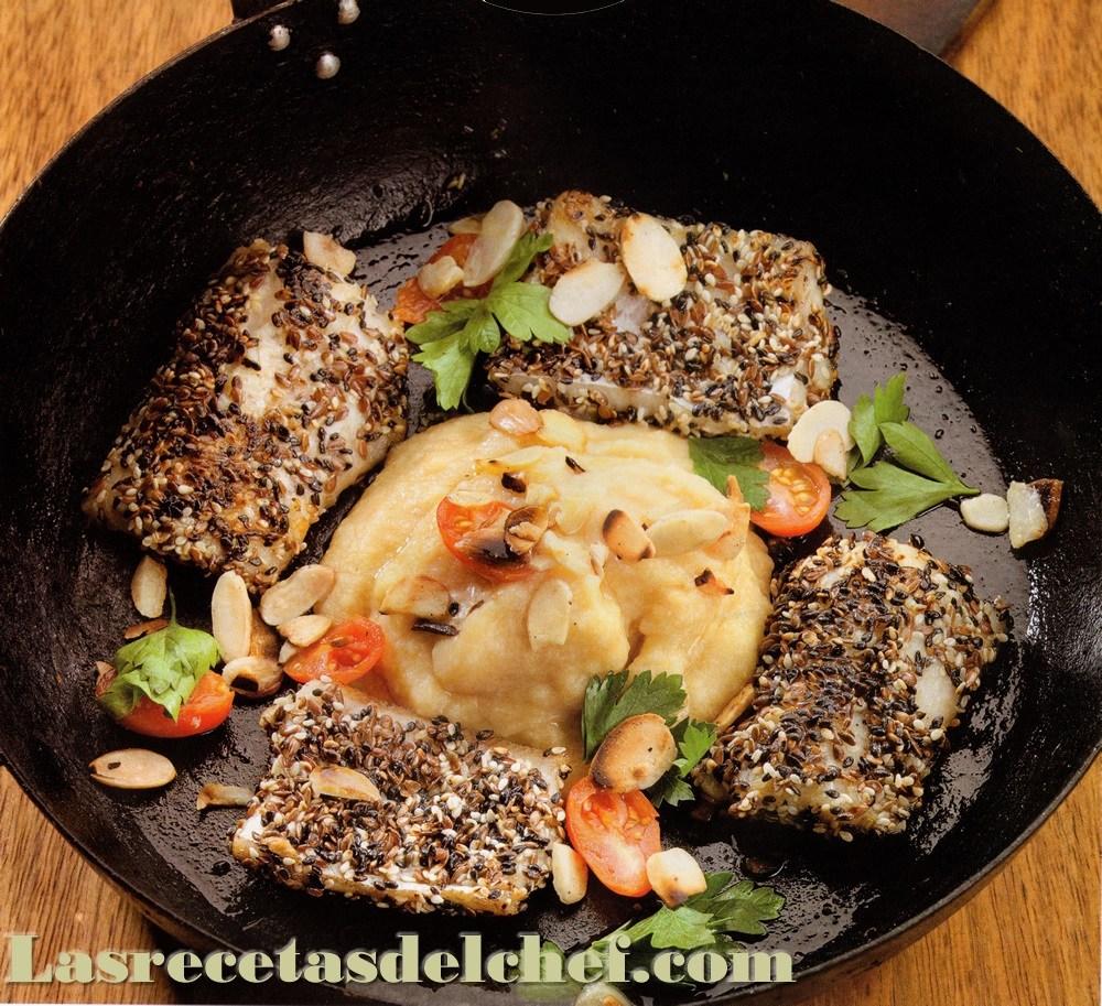 Pescado en costra de semillas, con puré de garbanzos y damascos desecados.