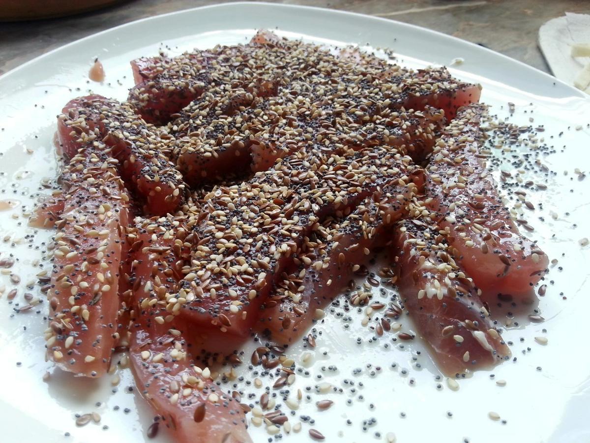 Humedecemos los filetes con aceite y los presionamos sobre las semillas. En una sartén caliente colocamos hilos de aceite preferiblemente oliva, luego las postas de pescado. Debemos tener cuidado porque las semillas saltan. Cocinamos de ambos lados. Si el filete de pescado es grueso, lo terminamos de cocinar en el horno, para evitar que se quemen las semillas.