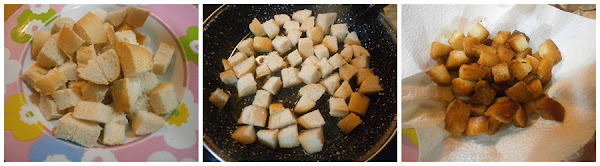 En una sartén ponemos a calentar un chorro de aceite y echamos los dados de pan duro; los salteamos durante unos minutos, removiéndolos con una cuchara de madera, hasta que estén dorados.