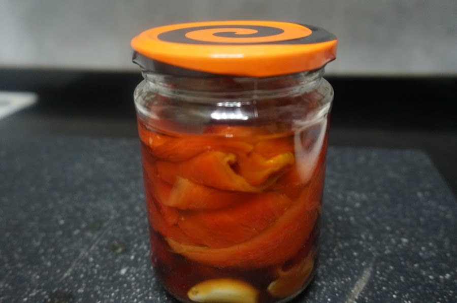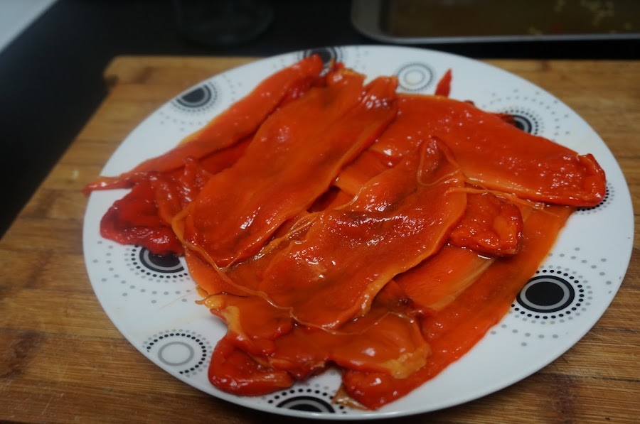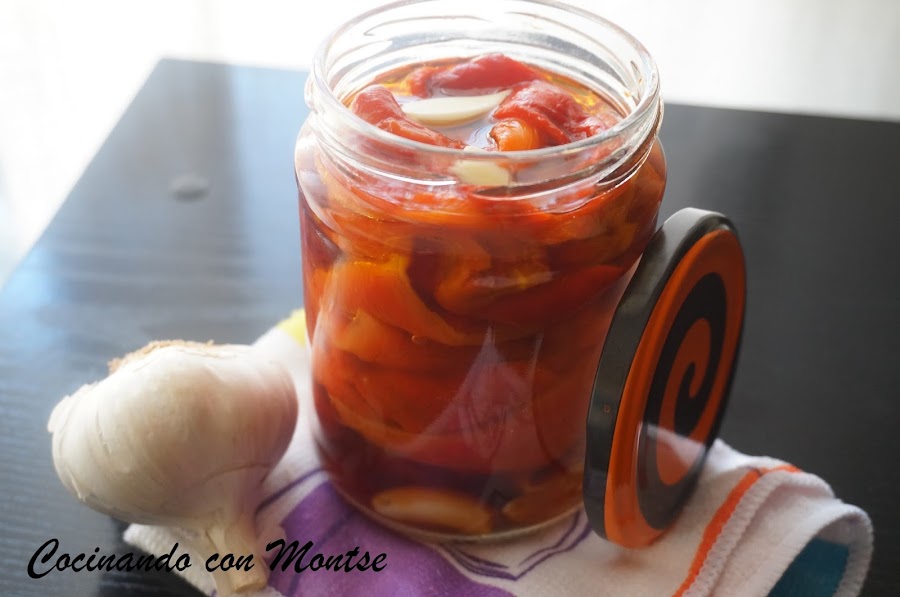Yo mezclo este jugo de los pimientos con aceite de oliva. Si los vamos a utilizar en el momento, los servimos en un plato con un ajo picado si os gusta y echamos un poquito del jugo con el aceite.