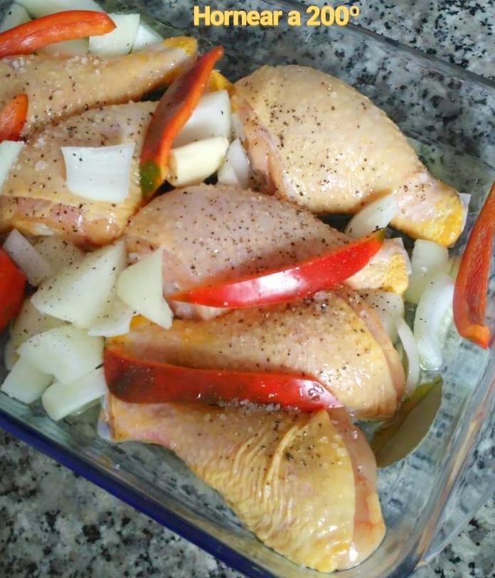 1. En una fuente apta para el horno ponemos el pollo que tendrá que estar salpimentado.