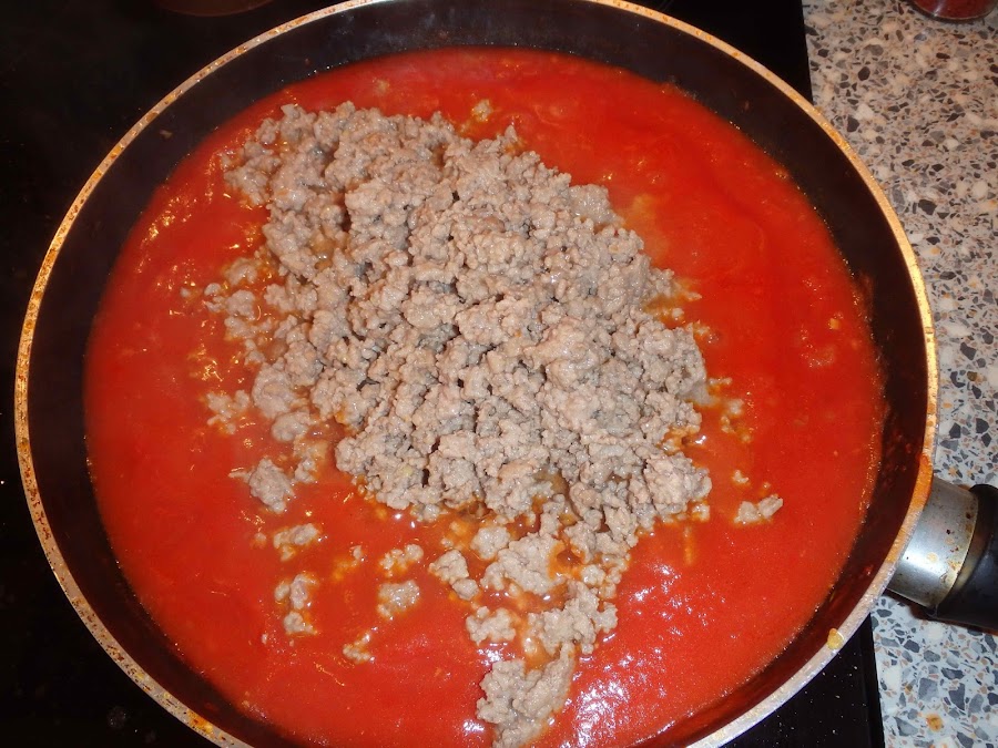 Dejamos que se vaya haciendo el tomate, unos cinco minutos a fuego medio, Entonces añadimos la carne medio cocida a la salsa de tomate y dejamos que se acabe de hacer todo junto a fuego bajo, para que se mezclen los sabores.