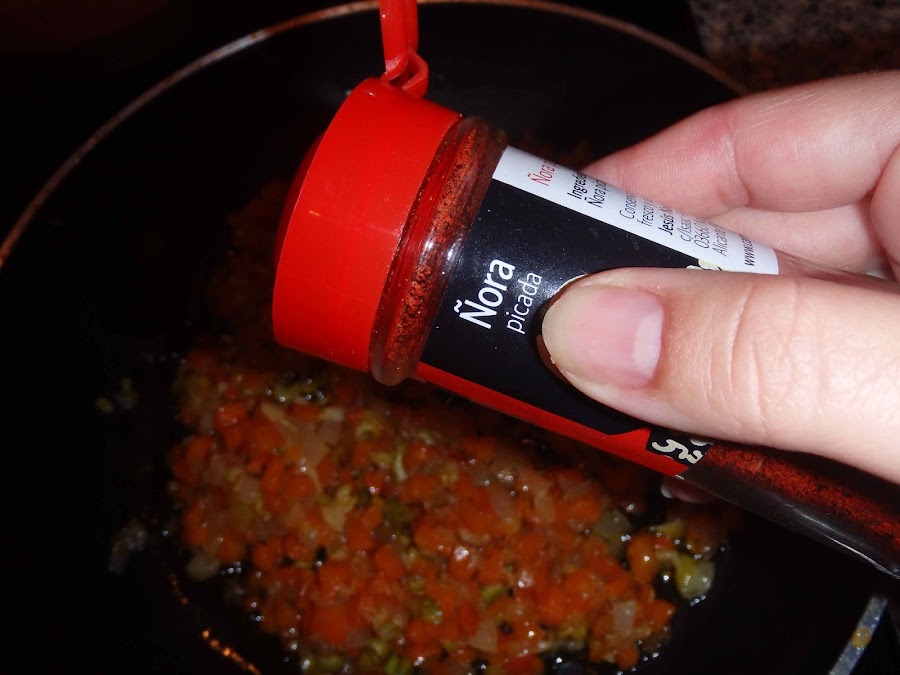 Cuando ya tenemos las verduras a punto apodemos añadir un poco de copos de ñora. La receta original no lleva ñora pero a mi me encanta el sabor que deja. Además desde que he descubierto estos copos y unos frasquitos con carne de ñora me he vuelto adicta, son la mar de baratos y no tienes ni que poner la ñora en remojo ni nada, ¡súper práctico!
