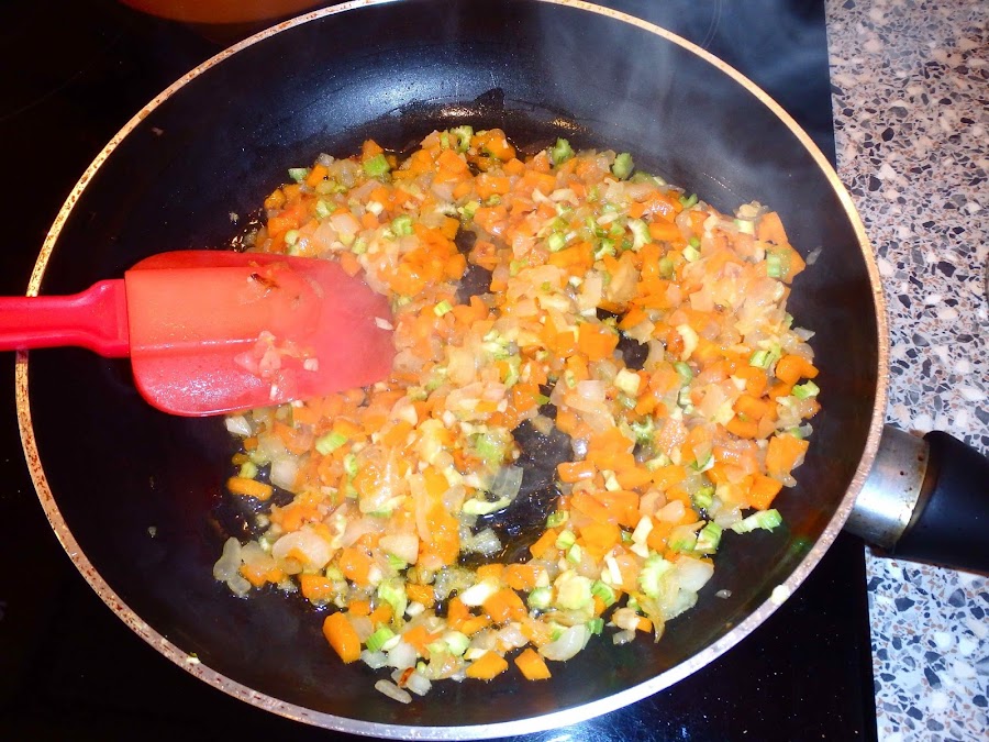 Añadimos el apio picado a la sartén con el resto de las verduras, la cebolla ya estará transparente. Dejamos que se sigan haciendo a fuego medio hasta que la cebolla esté bien caramelizada y el resto de verduras bien tiernas.