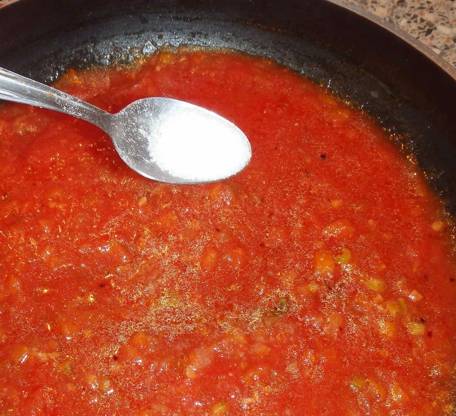 Finalmente añadimos el tomate triturado y una cucharadita de sal, Si al final falta se puede rectificar.