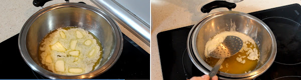 Lo primero que hemos de hacer es clarificar la mantequilla.Ponemos la mantequilla en un cuenco al baño maría y a fuego medio, sin que llegue a hervir el agua, dejamos que se derrita sin removerla dejando que se separe el suero de la grasa.