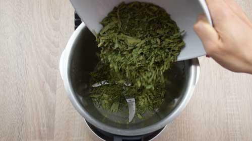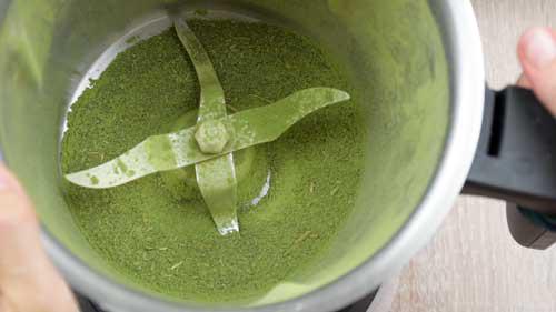 Para preparar la stevia casera en polvo es tan sencillo como triturar las hojas de stevia hasta convertirlas en un polvo muy fino.Yo he usado un robot de cocina potente. Puedes usar una picadora o batidora, o incluso hacerlo a mano con un mortero, aunque así tardarás más.