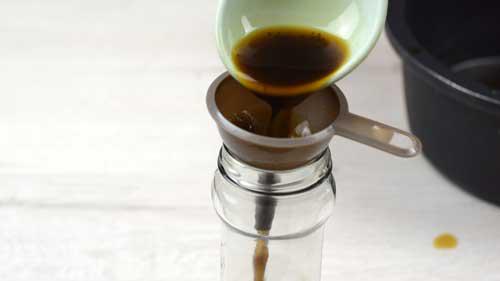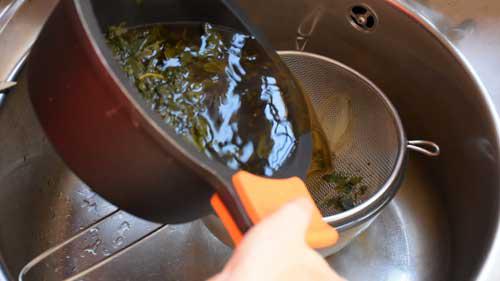4. Una vez que haya pasado el tiempo, colamos las hojas de stevia y la infusión que hemos obtenido la volvemos a colocar en la cacerola.