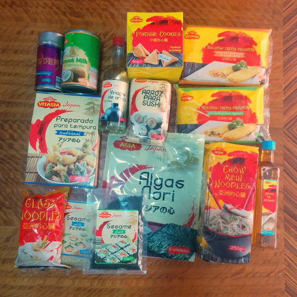 Otras veces han juntado productos de la India, de Japón y de China pero en esta ocasión solo tenían productos Japoneses, así que fui a por lo "básico": Arroz para sushi, vinagre de arroz, algas Nori, aceite de sésamo y cuatro cositas más..