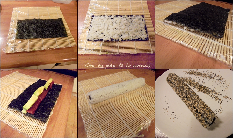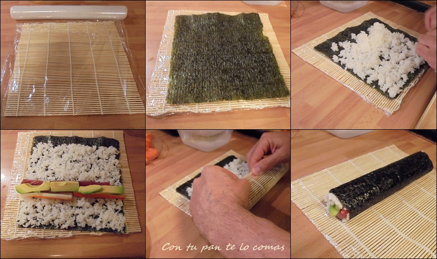 5. Ahora viene lo difícil, hacer los rollos. Tira con una mano hacia delante y con la otra vas empujando el rollo intentando que quede con la forma más redondeada posible. La parte del alga que dejamos sin arroz la humedeceremos con agua para que el rollito quede bien pegado.