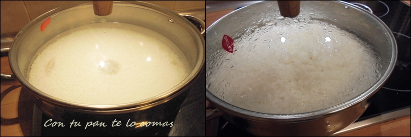Se necesita la misma cantidad de agua que de arroz (en nuestro caso 750 gr. de los dos), lo pondremos en una olla con agua fría, sin aceite ni sal. Lo acercamos al fuego (al máximo) y esperaremos a que comience a hervir. El proceso de hervir el arroz lo haremos con la tapa puesta todo el tiempo, así que es preferible que la tapa sea de cristal para ver cómo va y no abrir en ningún momento.