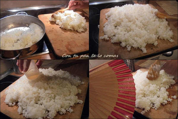 6. Este aderezo lo echamos por encima del arroz y empezamos a mezclar con una cuchara de madera y a atemperar el arroz con un abanico (entre dos se hace mejor...yo soy la del abanico ).¿ Tiempo? No sé decirte, hay que mezclar y abanicar hasta que esté frío. Debe quedar pegajoso, muy pegajoso, lo que es imprescindible para poder hacer los rollitos.