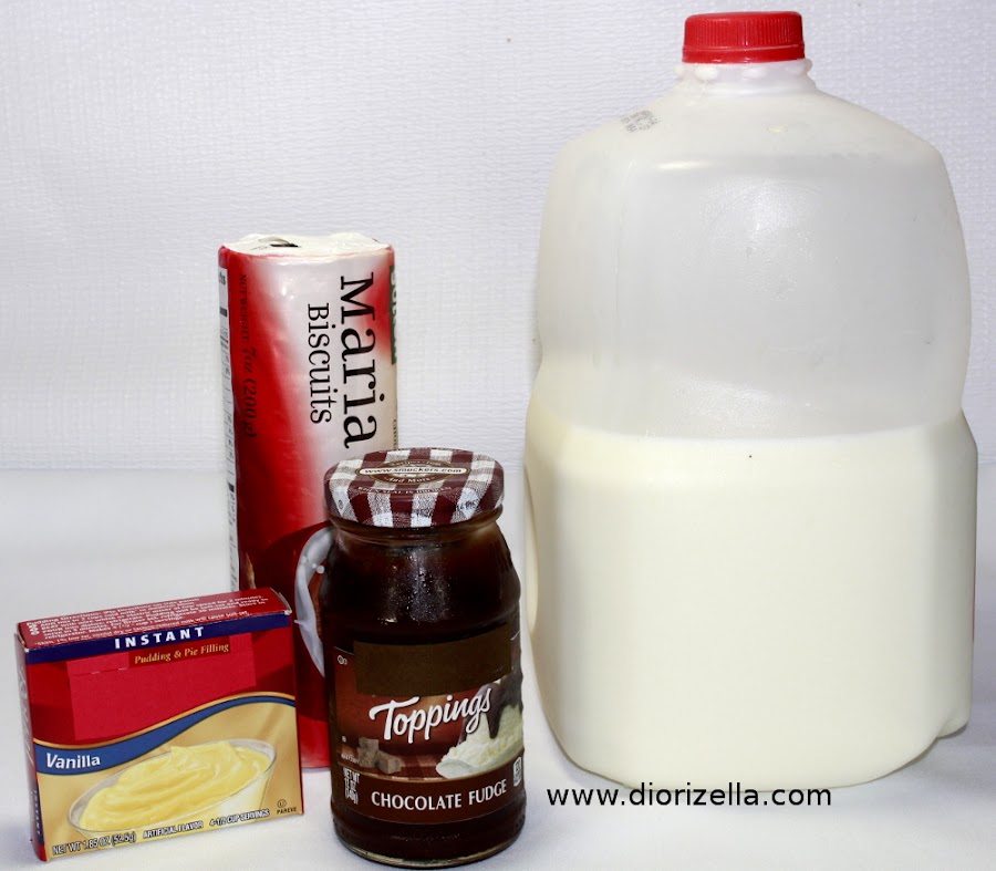 Los ingredientes que vas a necesitar son: 2 cajas de pudin de vainilla instantáneo, galletas Maria o las de tu preferencia, fudge de chocolate y leche fresca.