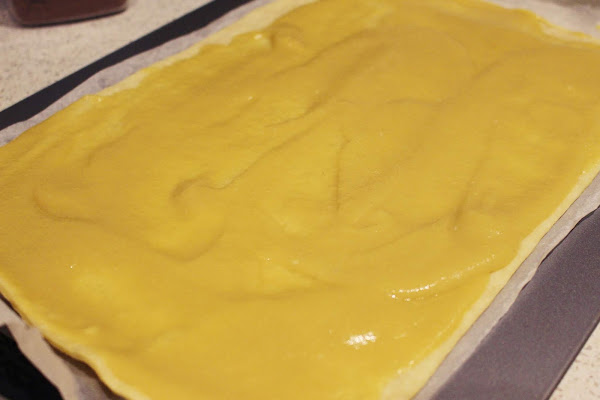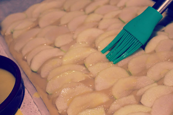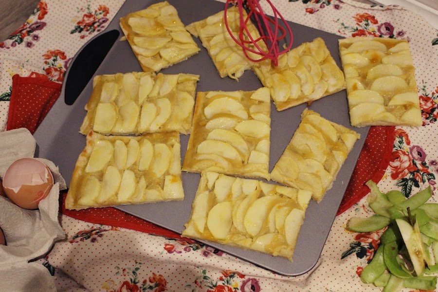 una base de hojaldre que previamente a pasado por el horno para pre hornearse montamos la crema y la manzana sobre ella, volvemos al horno 25 minutos más y tenemos ya un postre delicioso.
