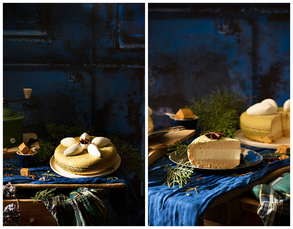 Un par de horas antes de servir sacamos del congelador y desmoldamos sobre el plato de servir. Si vas a usar el spray terciopelo hay que ponerlo justo en este momento, con la tarta recién sacada del congelador, para lograr el efecto velvet. Seguidamente introducimos en el frigorífico para que poco a poco le suba la temperatura y tenga la textura perfecta para servir.