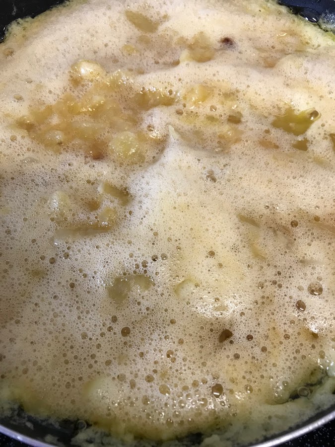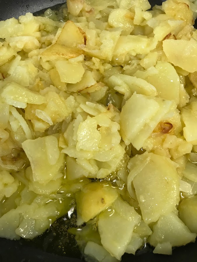 El aceite: no hay más discusión aquí, el aceite de oliva virgen es el mejor. Tiene que ser abundante pero no una piscina y cuando acabemos de freír, retiraremos el sobrante (con la suerte de que luego se puede emplear en otra cosa). La temperatura debe ser alta pero sin pasarnos. No buscamos obtener patatas fritas; es más como un confitado por lo que el color dorado no es una referencia, aunque al final les puedes dar un punto subiendo el fuego, que le dará un gustillo a la tortilla. Estarán listas cuando estén blandas. Hay que probar!