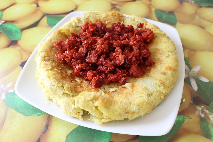 lleva chorizo con ello nos lleva aun mas a esta España profunda que entre su dieta mediterranea sus embutidos y la tortilla española, no podemos parar de reconocer su gastronomia.