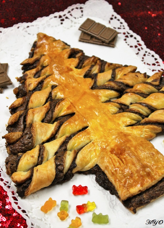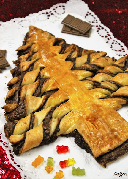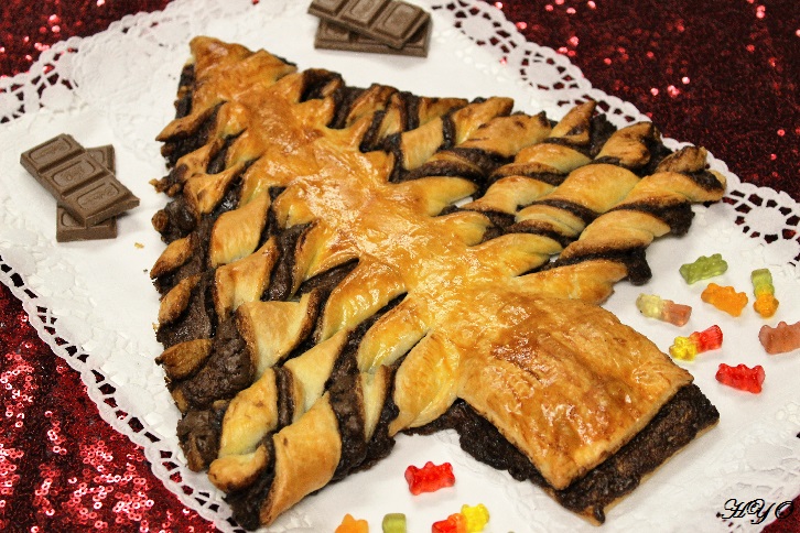 5. Colocamos el árbol sobre la bandeja del horno, lo pincelamos con huevo batido y damos forma de tirabuzón a las ramas.