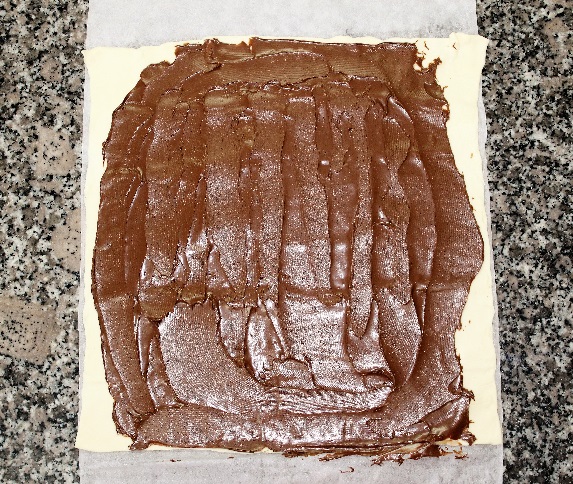 2. Untamos la masa con la crema de cacao sin llegar a los bordes.