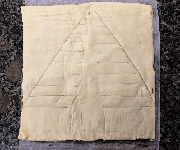 3. Cubrimos con la otra lámina de hojaldre. Con un palillo o brocheta trazamos la silueta del árbol y las ramas antes de cortarlo con un cuchillo. Yo lo he hecho a mano alzada, pero si lo preferís utilizad una regla.
