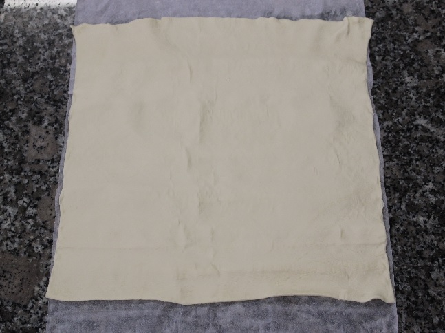 1. Estiramos la primera lámina de masa de hojaldre sobre un pliego de papel sulfurizado o de horno, podéis aprovechar el papel que trae la masa.