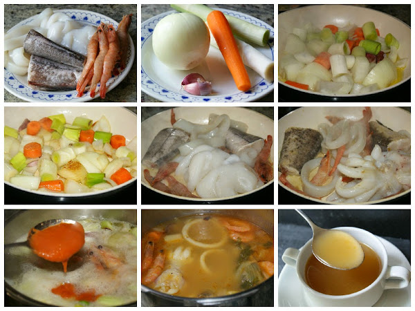 Poner a calentar una olla con tres litros de agua y dos pastillas de caldo de ave o sal. Cortar las verduras en trozos grandes y saltearlas ligeramente en una sartén con un poco de aceite. Cuando quieren tomar color, retirarlas e introducirlas en la olla. En el mismo aceite se marca el pescado sin llegar a freírlo y una vez se ha dorado un poco la capa exterior (el interior sigue estando crudo) se introduce en la olla. Añadir 3 cucharadas de tomate frito casero, con la finalidad de darle un poco de color, y dejar cocer durante media hora.