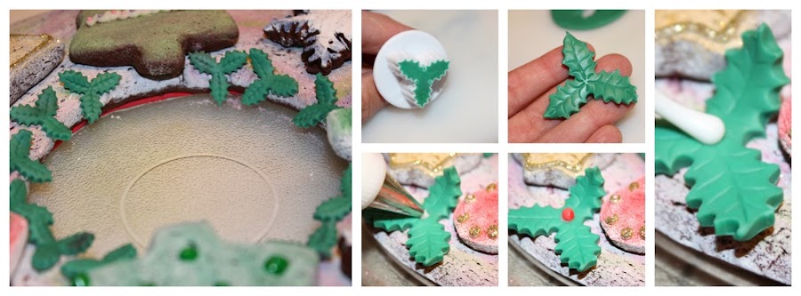 Por último, hice unas hojas con fondant verde y las coloqué sobre la corona de galleta. No me hizo falta poner pegamento comestible, pero si vieras que no se pegan bien, puedes usar un poco de agua, licor o pegamento comestible, aunque creo que no hará falta.