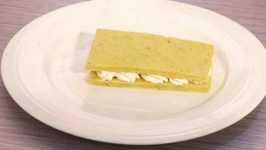 En una de las bases del pastel, echamos el jarabe azucarado y rellenamos de nata (crema de leche) que montamos anteriormente. En otro base ponemos también jarabe y montamos encima de la parte rellena quedando el pastel de aguacate