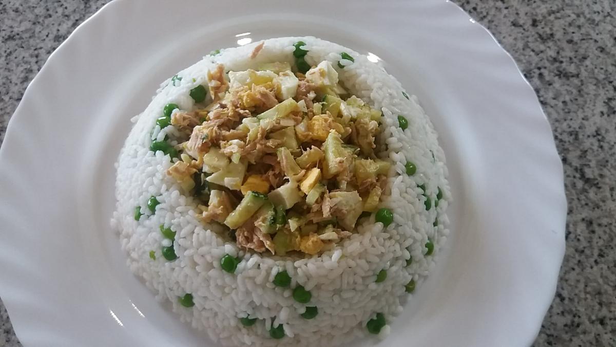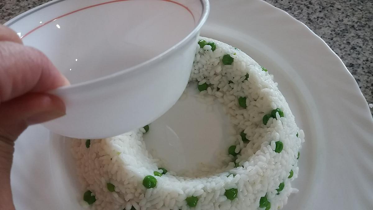 3.- Echa alrededor del bol central el contenido de tu preparación. En mi caso, como ves es un arroz cocido para hacer una corona de arroz fría. Aplana bien para que quede bien compacto. Deja que coja forma durante un par de minutos.