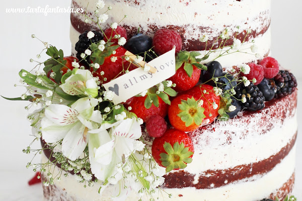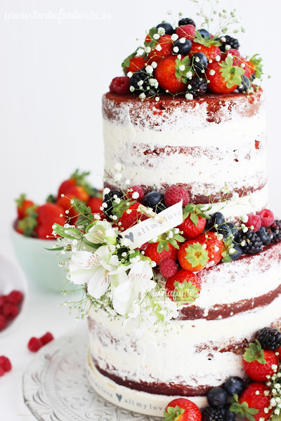 Hace mucho tiempo que quería hacer una tarta desnuda, un naked cake, y por fin ha llegado al blog. Son tartas decoradas con elementos frescos como las flores y la fruta, trasmiten sencillez y muestran el bizcocho y el relleno de una forma natural, esa naturalidad es lo que las hace unas tartas preciosas.