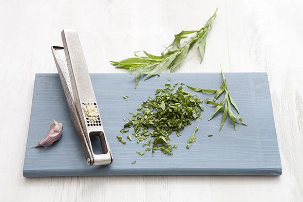 Exprime el limón y coloca en un tazón. Pica el estragón y el diente de ajo, a continuación, deja a un lado.