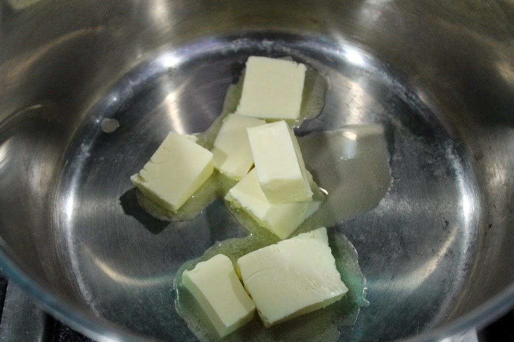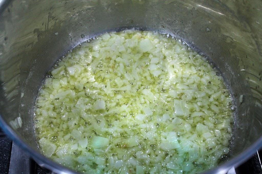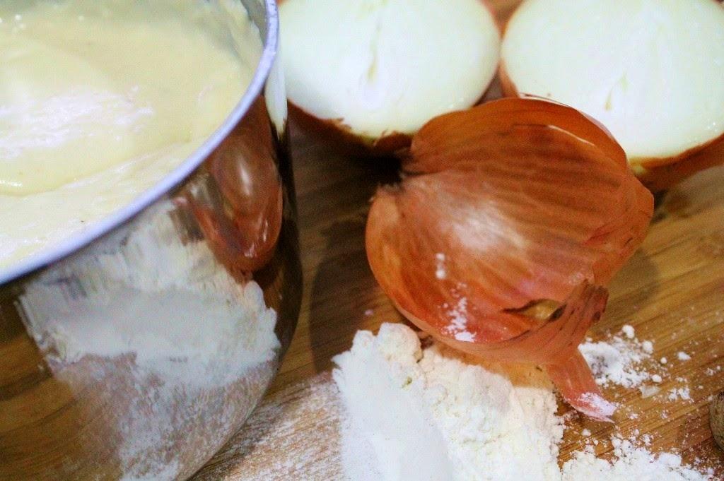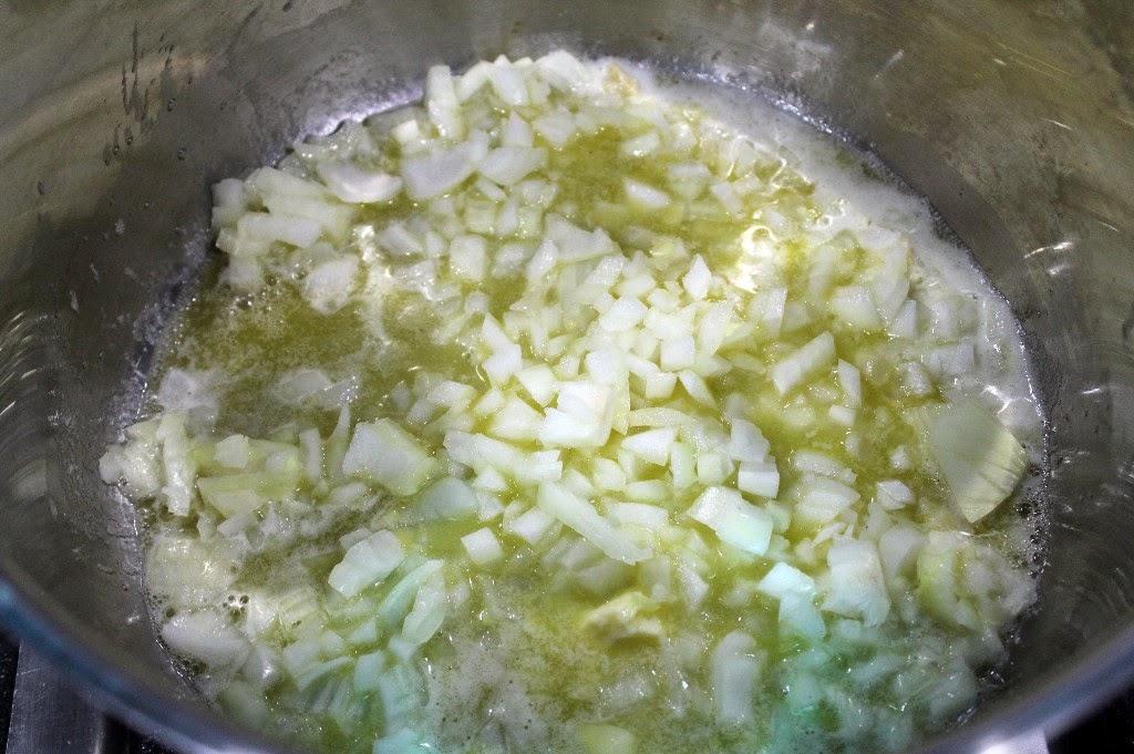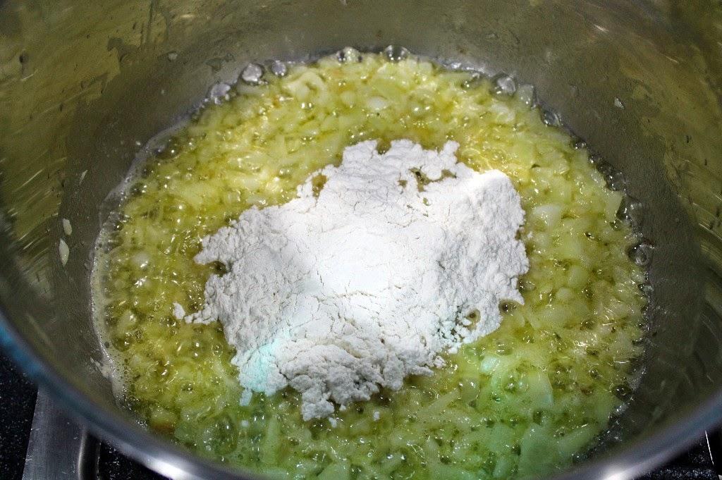 En un cazo al fuego ponemos la mantequilla y cuando esté derretida añadimos la cebolla y la pochamos bien hasta que esté blanda. Cuando la cebolla esté lista añadimos la harina, esto se llama hacer un roux (bueno el roux se hace sin cebolla)