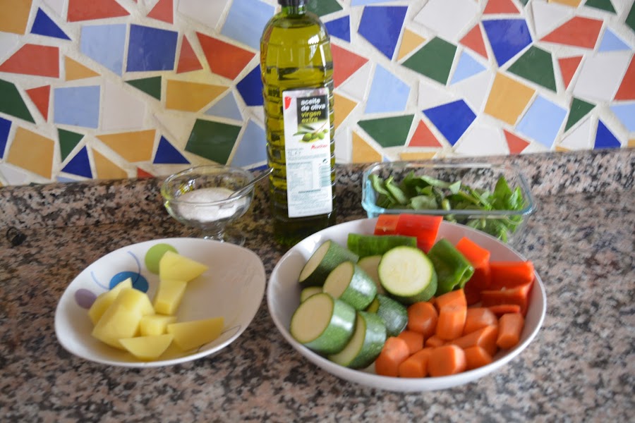 Esta receta de hoy lleva todas estas verduras. Previamente lavadas y peladas las que hay que pelar (zanahoria y patata):