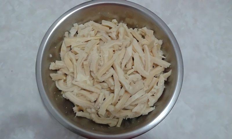 Luego de escurrir y enfriar cortar el mondongo en tiras no muy grandes, particularmente me gusta sacarle de la parte del mondongo que se le llama esponja con una cuchilla afilada bastante para evitar masticar esa parte que a mi gusto no es tan tierna y reservamos.