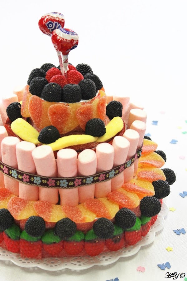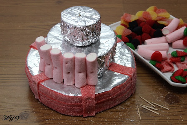 En concreto, esta tarta de gominolas la hice para mis sobrinos, que contaron con la ayuda del resto de la familia para comérsela. La mayor parte de las chuches ya las tenía en casa y quería darles salida, así que me apañé para hacer el diseño sin tener que invertir más. No osbtante, si las vais a comprar os recomiendo que penséis muy bien qué tipo de chuches necesitaréis y cómo vais a combinarlas, teniendo en cuenta su tamaño, forma y color.