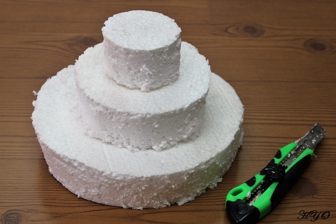 1. Comenzamos haciendo las base de la tarta. Para ello debemos tener en cuenta la forma elegida (rectangular, circular, en corazón...) y la altura que se desea. En este caso vamos a hacer una tarta circular con tres alturas. Con ayuda de un cúter cortamos tres discos de pórex de tamaños desiguales, de mayor a menor (igual que en la foto). También los podéis adquirir ya cortados en numerosos bazares.