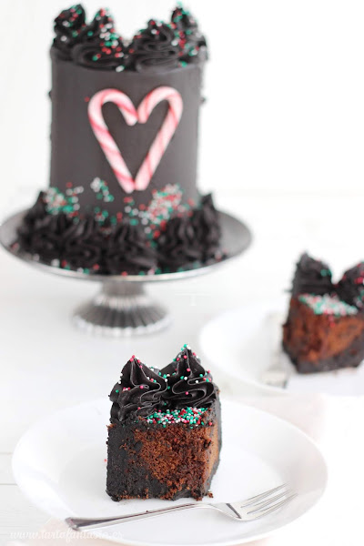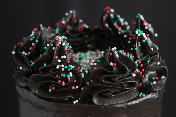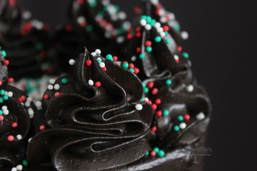 La crema es un merengue suizo buttercream y a pesar de lo oscuro sólo lleva cucharadita y media (tamaño moca) de colorante, el truco para conseguir este color y la elaboración de la crema lo publiqué en el anterior post, con la crema resultante ha sido suficiente para rellenar y cubrir esta tarta de 18 cm de altura y 10 de diámetro.