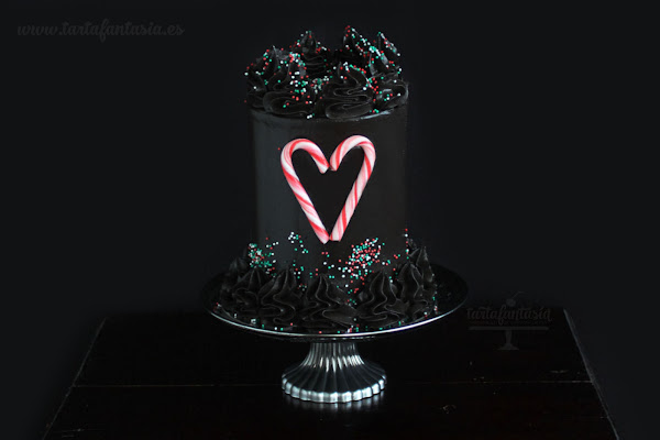 Mi último trabajo repostero del 2019 también es bastante especial, una tarta de Navidad de color NEGRO ¿eh? a ¿qué no lo esperabas? he experimentado con nuevos tamaños de moldes, con diámetros más pequeños, para conseguir que una tarta de 8-10 raciones mucho más esbelta y el resultado me ha encantado, con esta cantidad de raciones tengo suficiente para mis reuniones familiares.